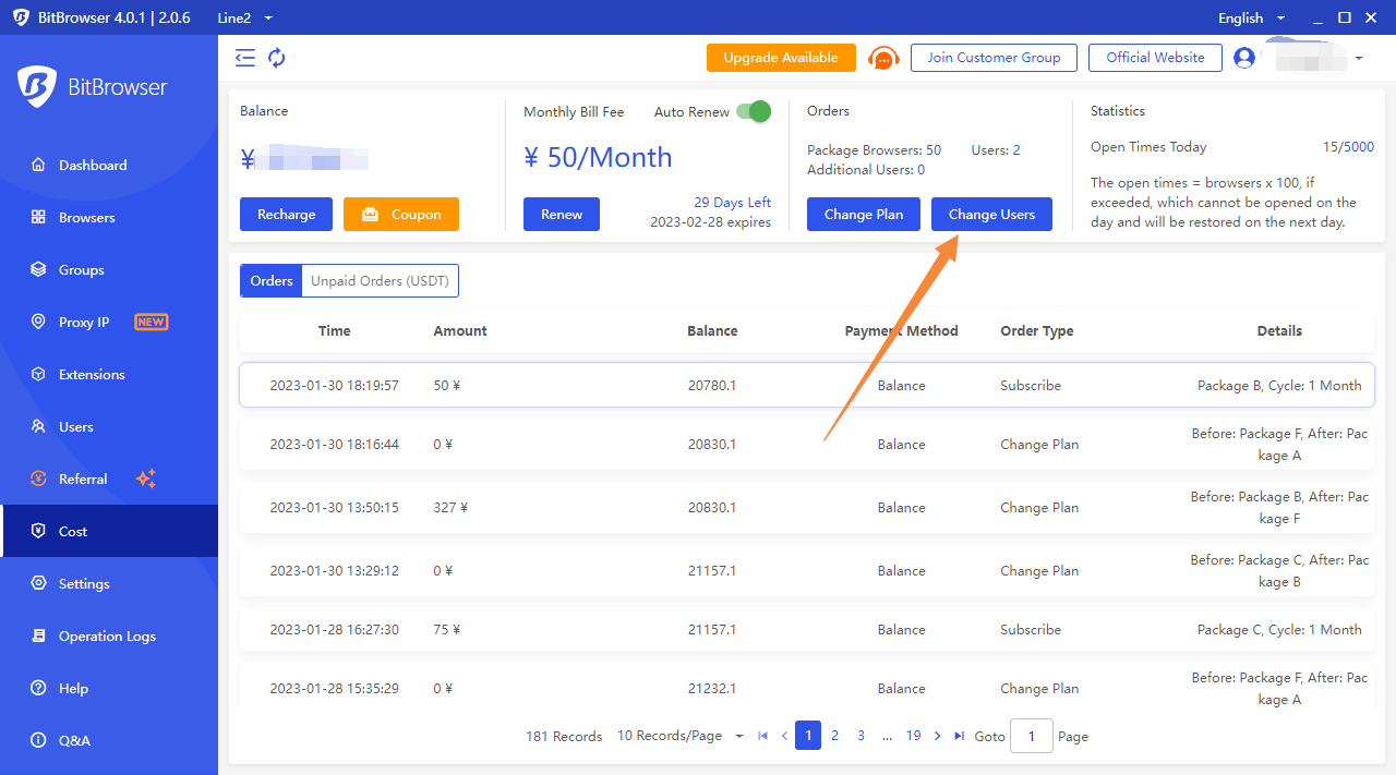 * Subscrible: Launch->To "Browsers"->Click "Subscribe" button, or to "Cost"-> Click "Subscribe" or "Change Plan".