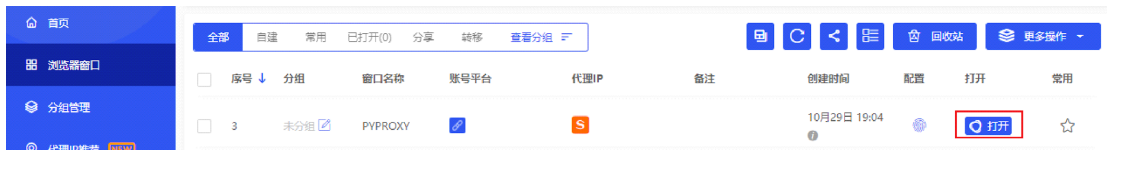 第6步、您可以在“浏览器窗口”界面，看到刚刚配置的窗口，点击“打开”按钮开始使用！